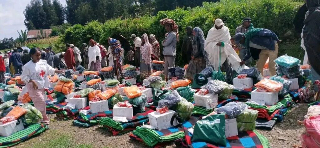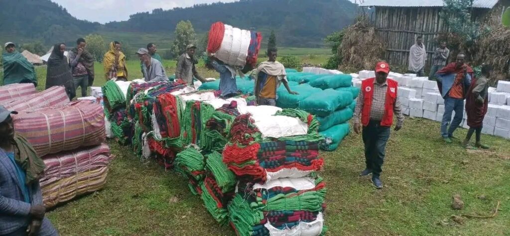 የኢትዮጵያ ቀይ መስቀል ማህበር በኤፍራታና ግድም ወረዳ መስቀልበር ቀበሌ ነሀሴ 2/2017 በጎርፍ ለተጎዱ የህብረተሰብ ክፍሎች ምግብ ነክ ያልሆኑ ቁሳቁስ ድጋፍ አደረገ፡፡